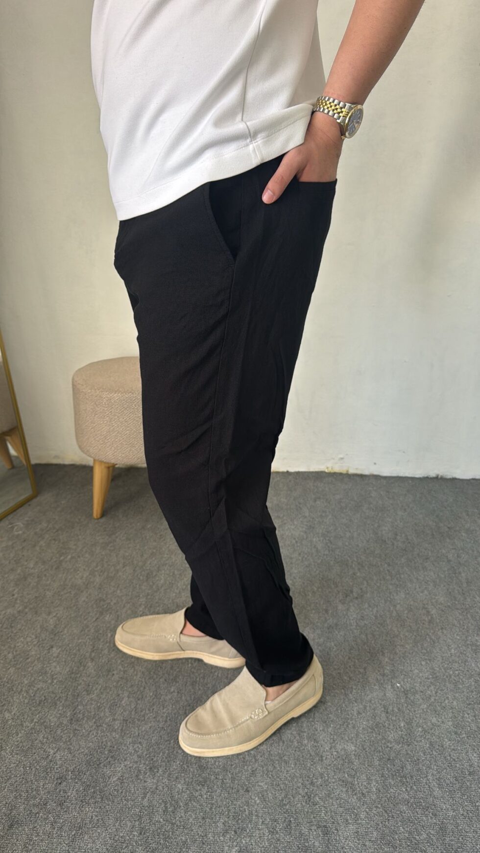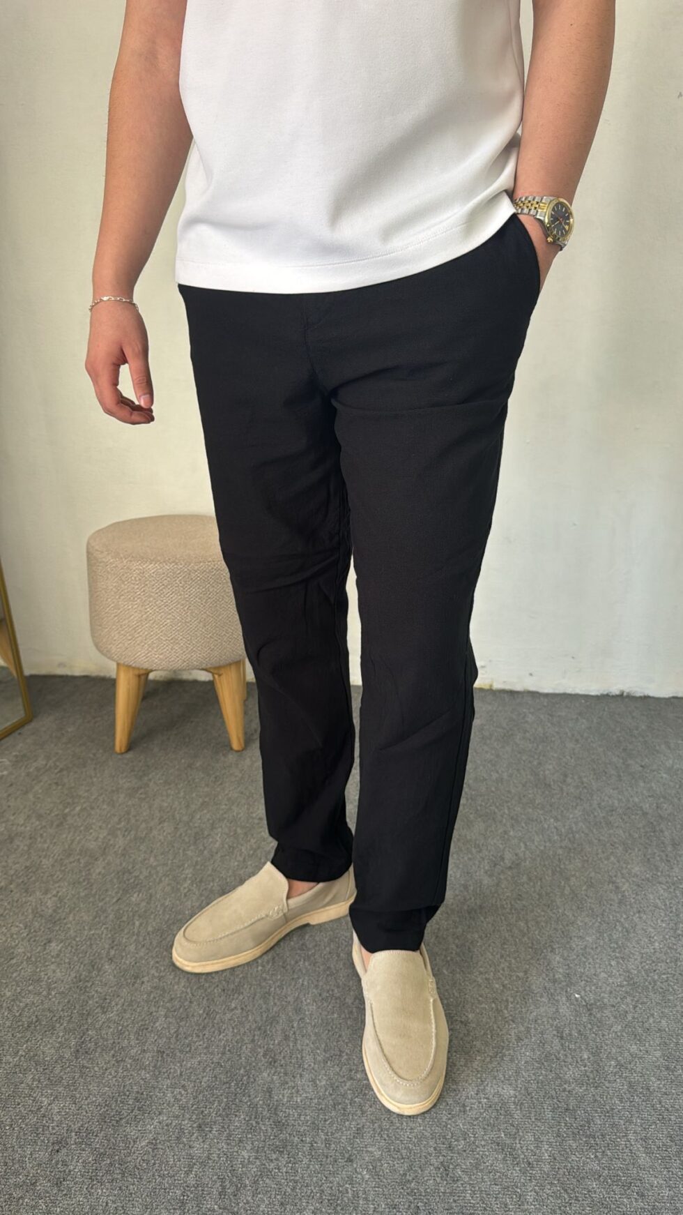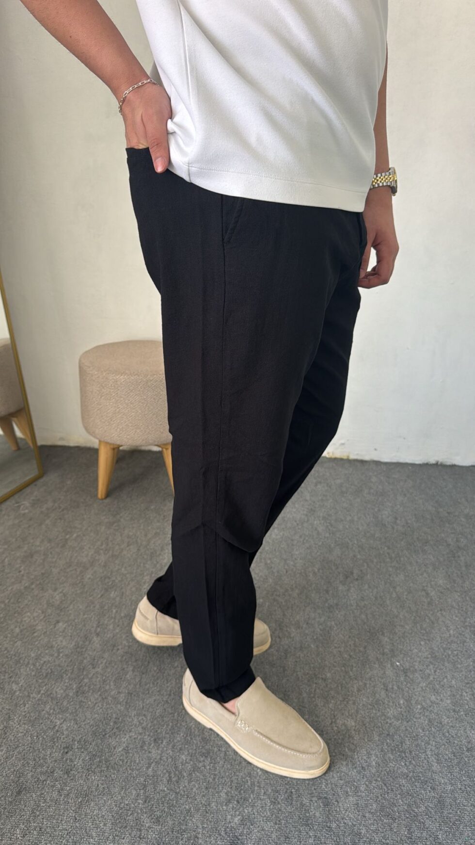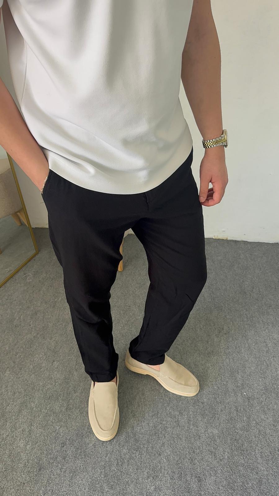 Yaz aylarının vazgeçilmezi olan keten kumaş ile tasarlanan bu siyah pantolon, hem şıklığı hem de konforu bir arada sunar. Hafif ve nefes alabilen yapısı sayesinde gün boyu rahat kullanım sağlar.