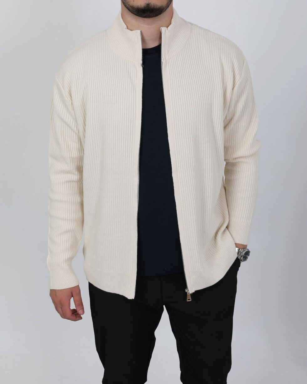 Erkek Ribanalı Fermuarlı Triko Hırka – Krem