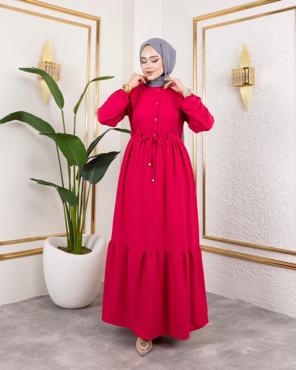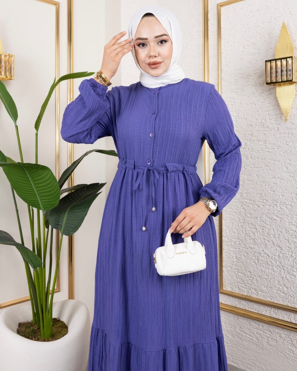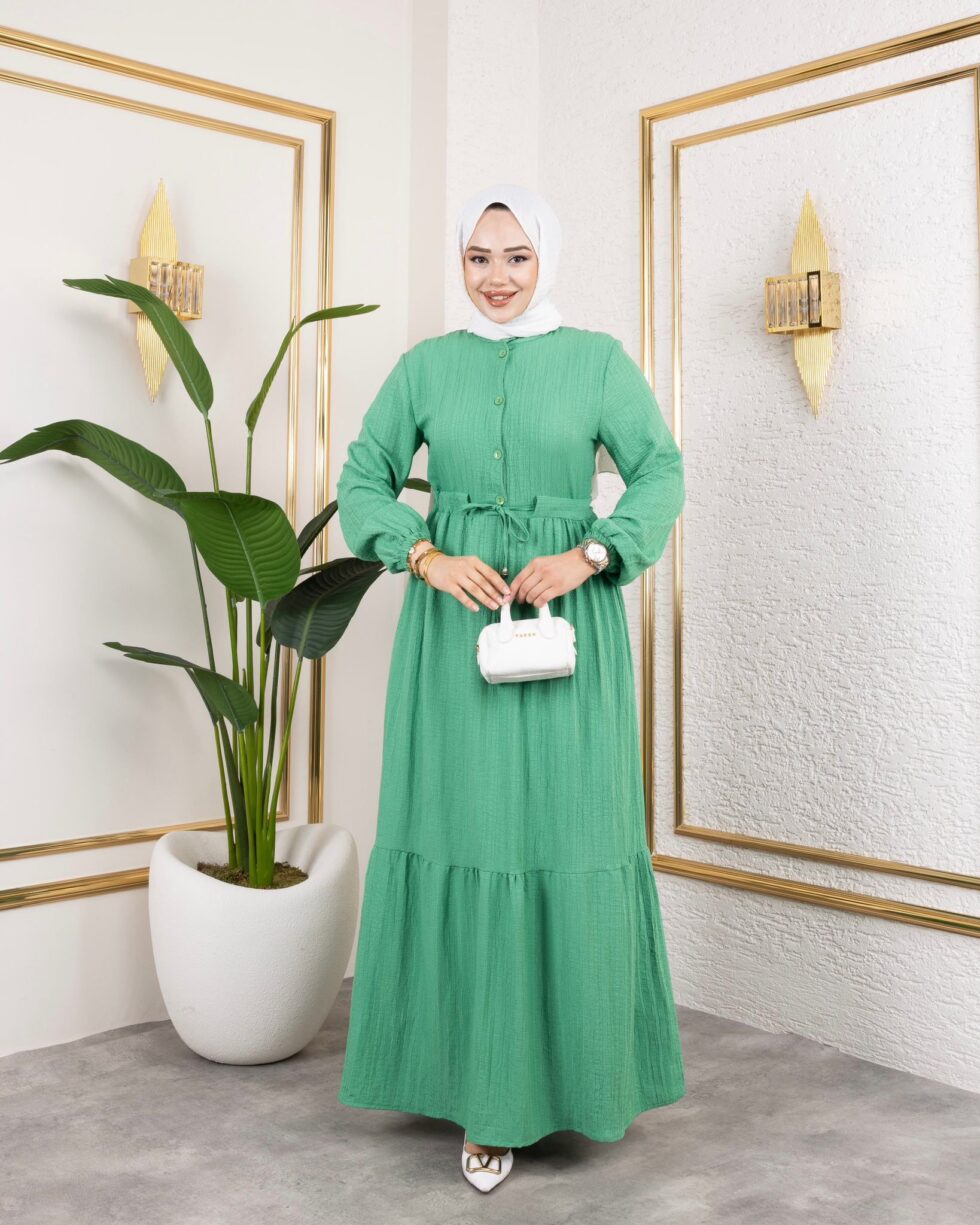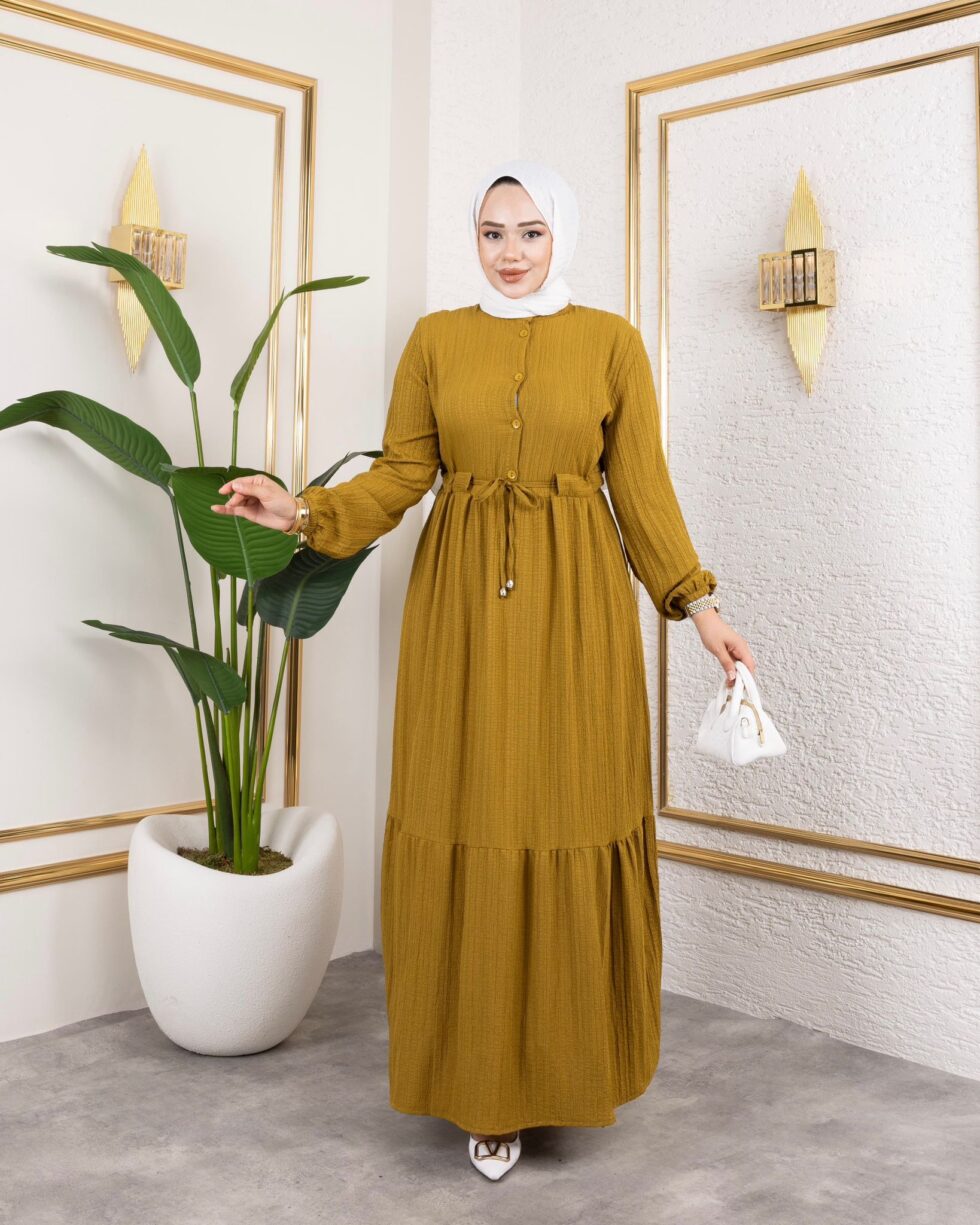 Zarafeti ve konforu bir arada sunan bu elbise, günlük şıklığın en özel tamamlayıcısı olmaya aday. Hafif dokulu kumaşı sayesinde gün boyu rahat bir kullanım sağlarken, belden bağlama detayı vücuda uyumlu bir duruş kazandırır. Düğme detayları ve katlı etek formu ile modern ve feminen bir görünüm sunar.