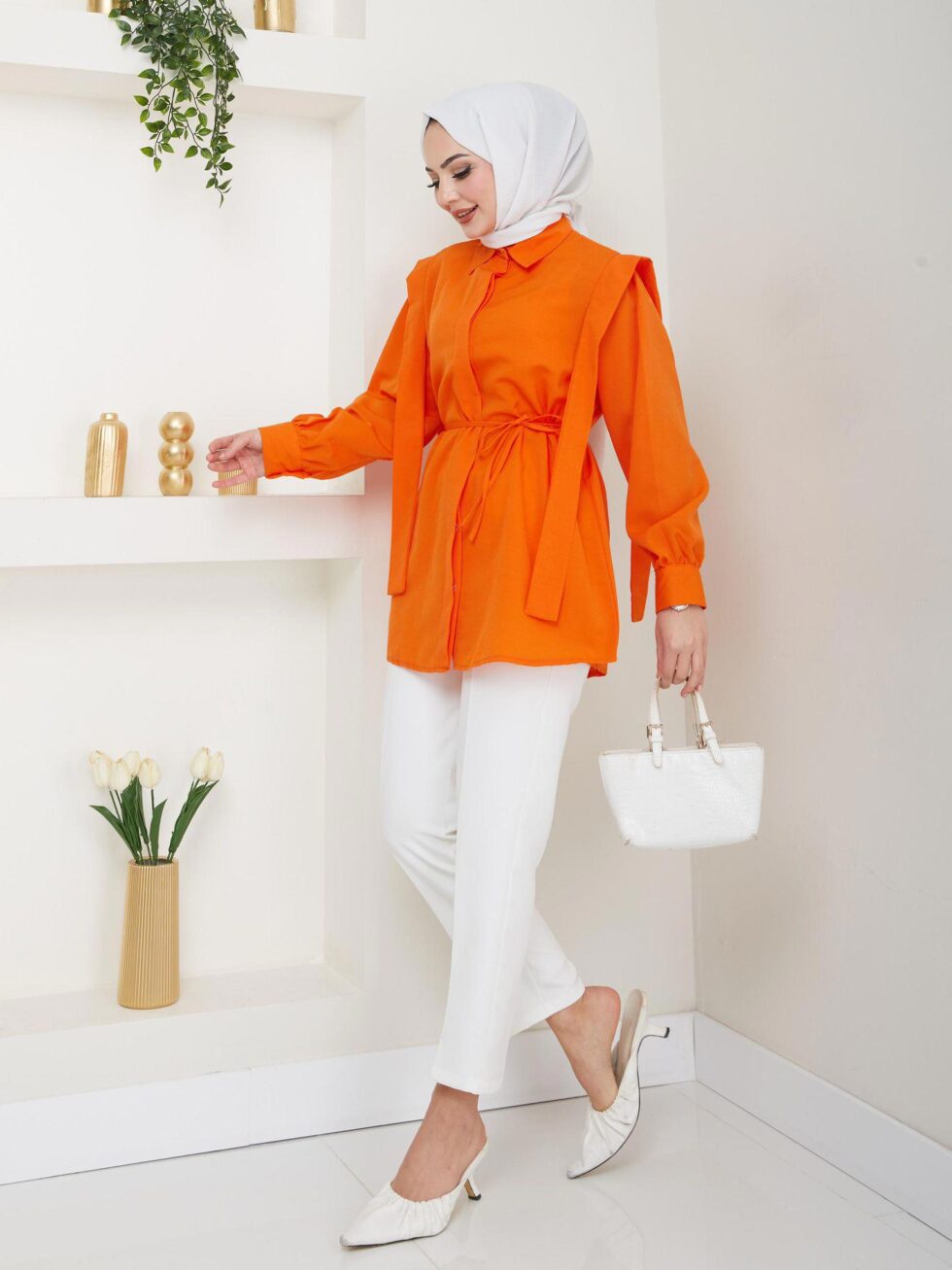 gizli pata sahip olan terikoton kumaştan üretilen gömlegimiz aynı zamanda beldeki kemeri ile ayrı bir hava katmaktadır.