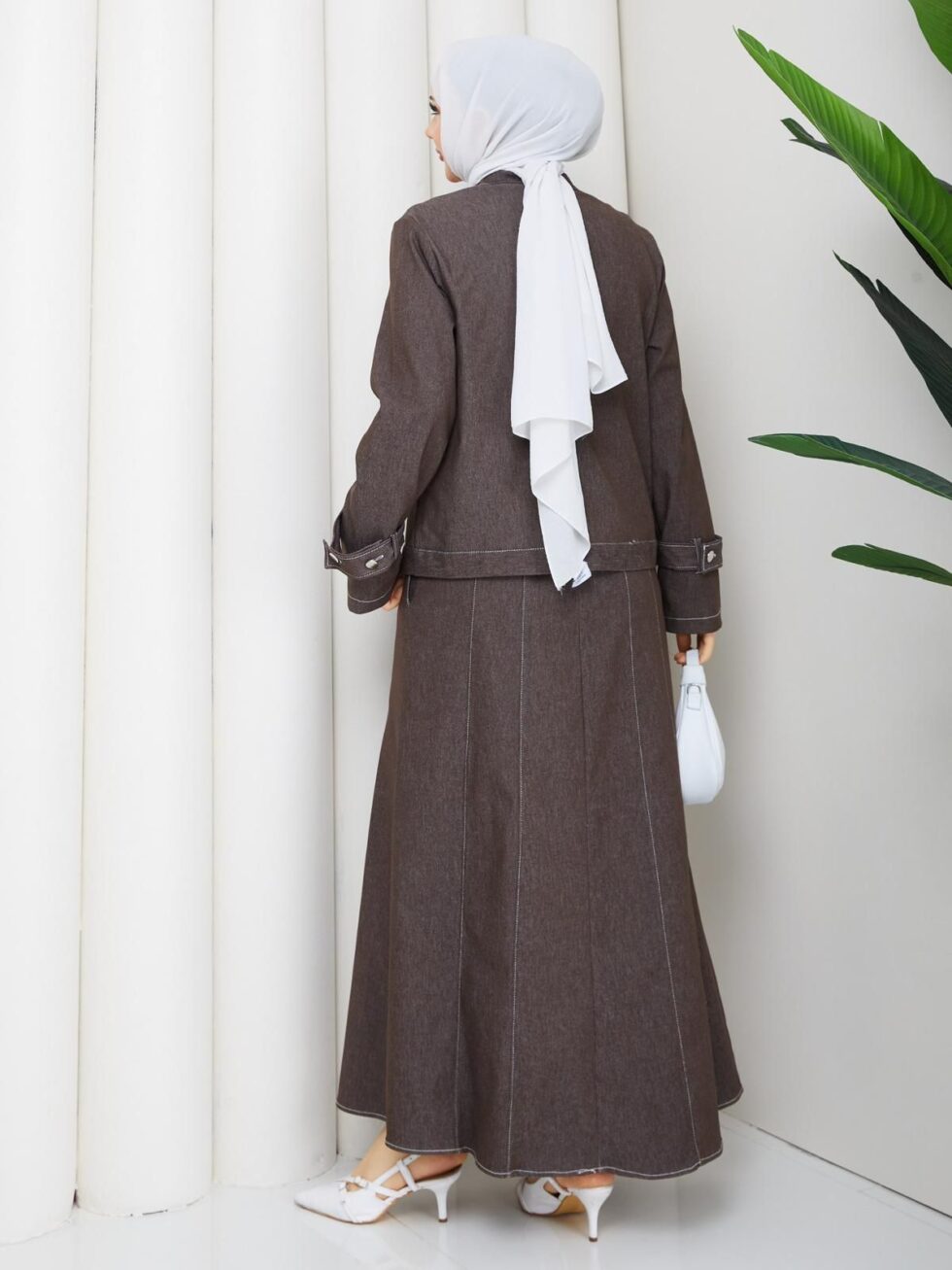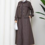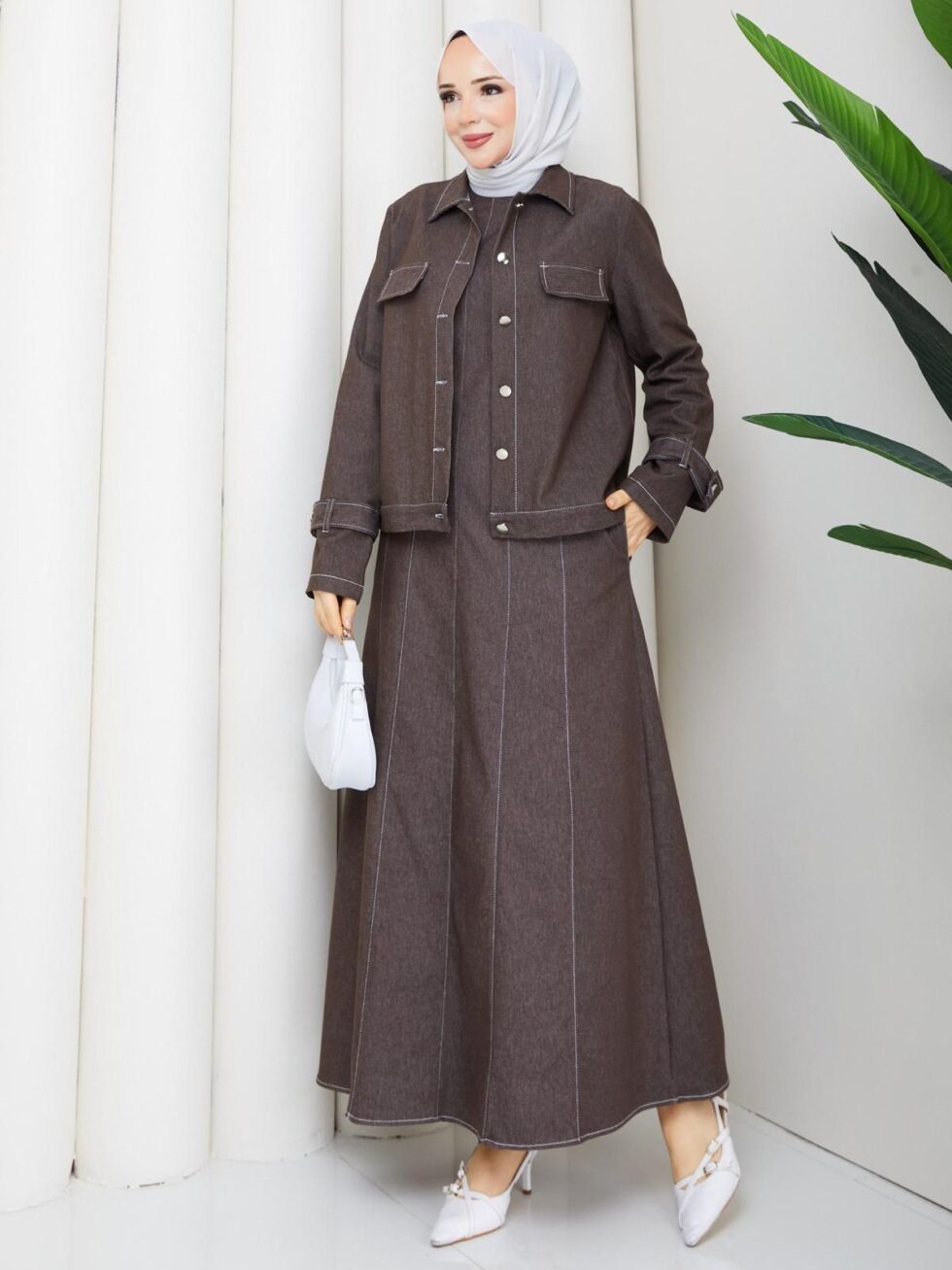 Modern çizgilerle tasarlanmış bu şık tesettür takım, güçlü ve zarif bir görünüm sunar. Ceket ve elbiseden oluşan kombin, sade şıklığı dikiş detaylarıyla ön plana çıkarır. Günlük kullanımdan özel davetlere kadar geniş bir kullanım alanına sahiptir.