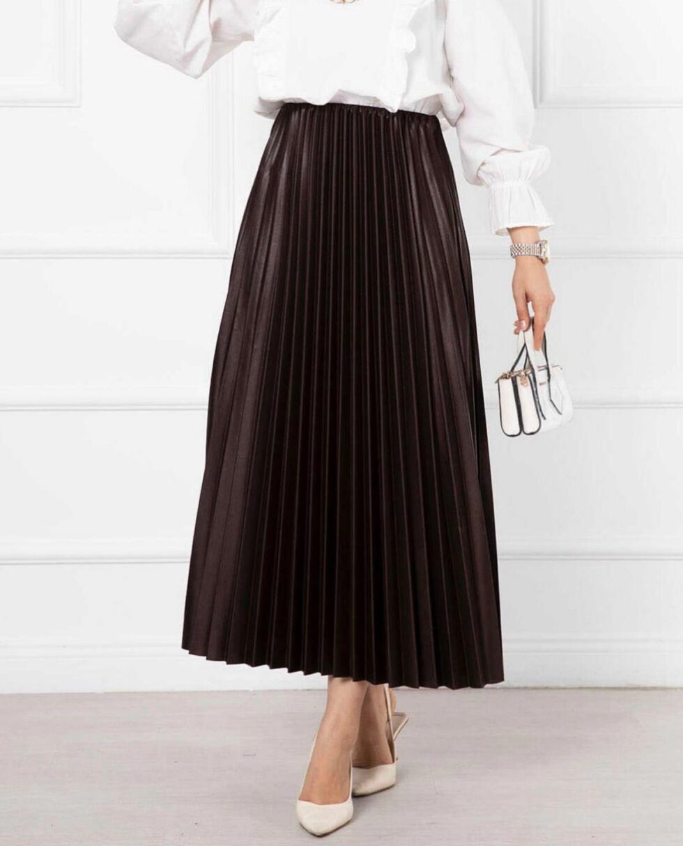 Genç ve dinamik tarzınızı yansıtan, vizon rengindeki düz desenli ince piliseli etek ile gün boyu rahatlığınızdan ödün vermeyin.