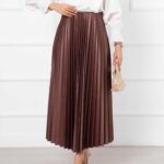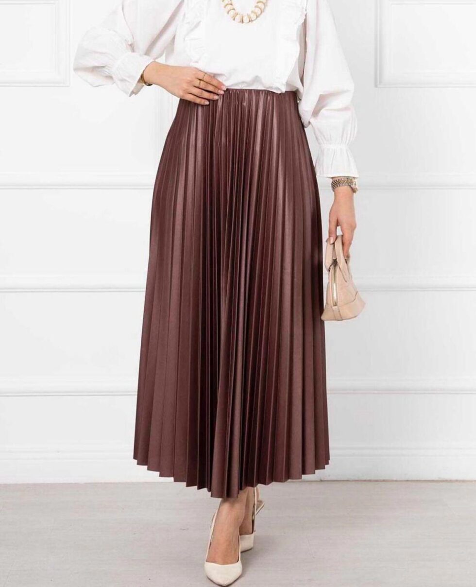 Genç ve dinamik tarzınızı yansıtan, vizon rengindeki düz desenli ince piliseli etek ile gün boyu rahatlığınızdan ödün vermeyin.
