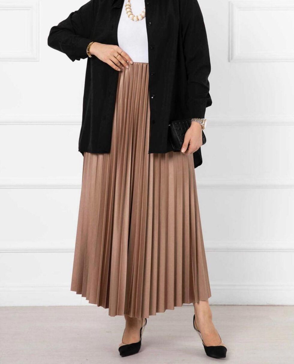 Genç ve dinamik tarzınızı yansıtan, vizon rengindeki düz desenli ince piliseli etek ile gün boyu rahatlığınızdan ödün vermeyin.