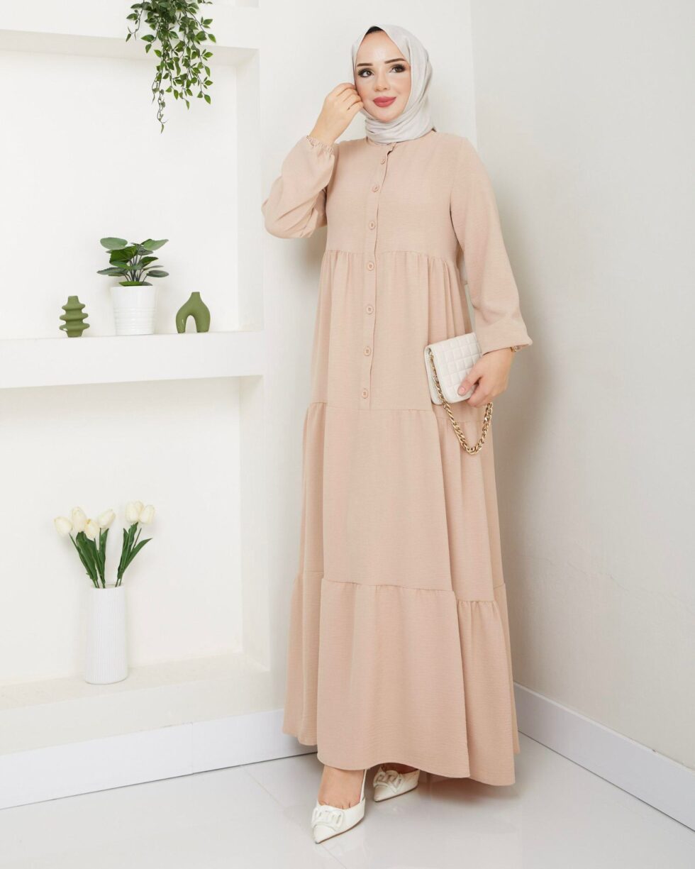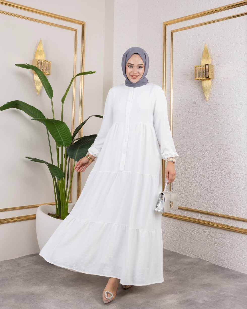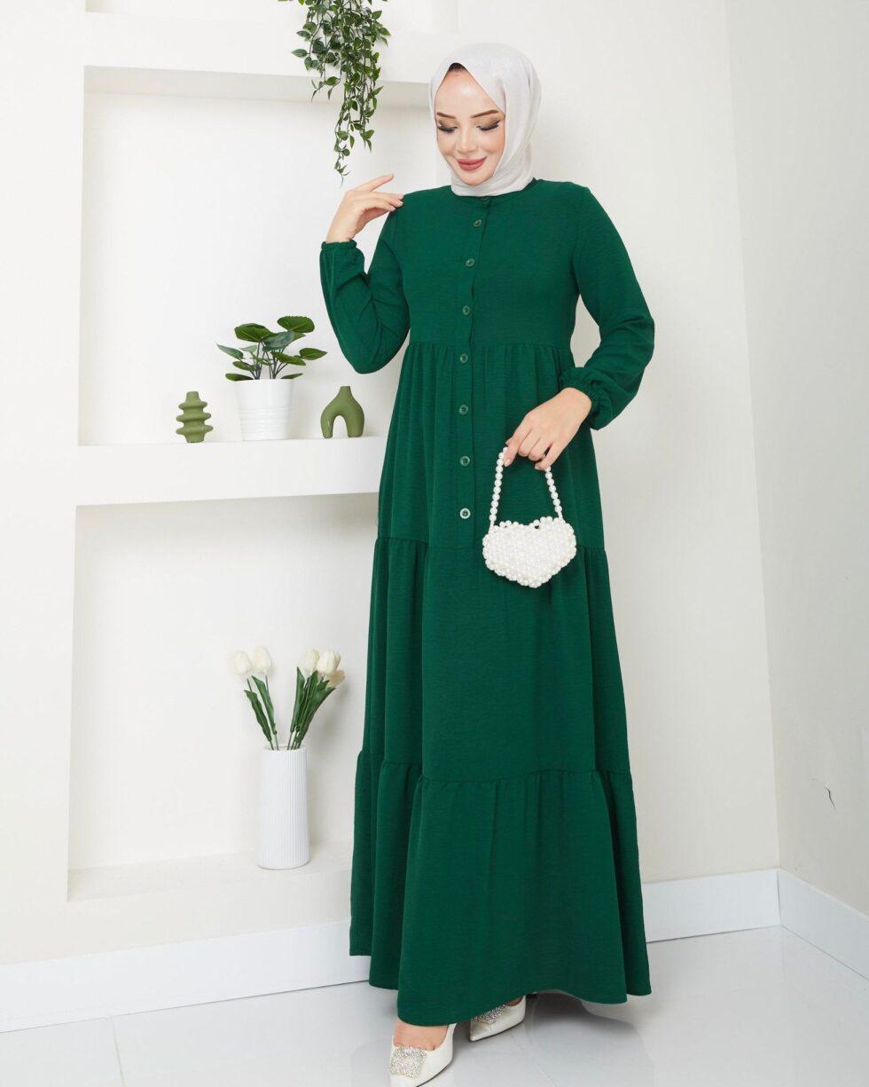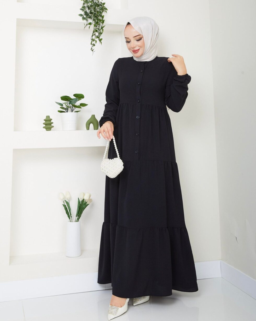 Zamansız şıklığın modern yorumu olan bu uzun elbise, sade ve zarif tasarımıyla günlük stilinize sofistike bir dokunuş katıyor. Ön kısmındaki düğme detayları klasik bir görünüm sunarken, katlı etek formu elbiseye hareketli ve feminen bir duruş kazandırır.