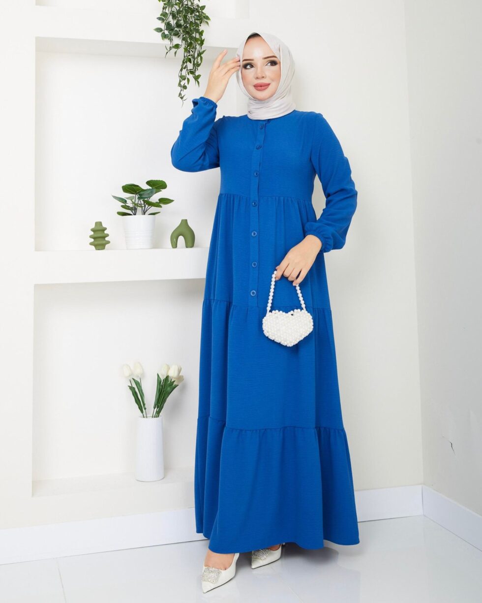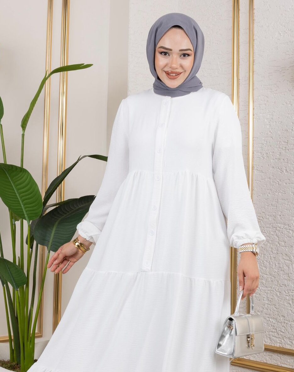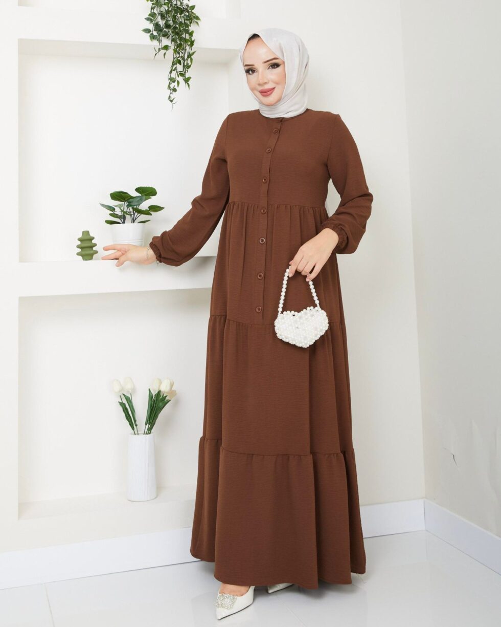 Zamansız şıklığın modern yorumu olan bu uzun elbise, sade ve zarif tasarımıyla günlük stilinize sofistike bir dokunuş katıyor. Ön kısmındaki düğme detayları klasik bir görünüm sunarken, katlı etek formu elbiseye hareketli ve feminen bir duruş kazandırır.