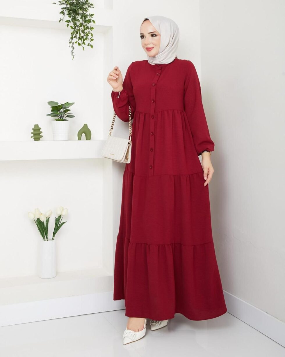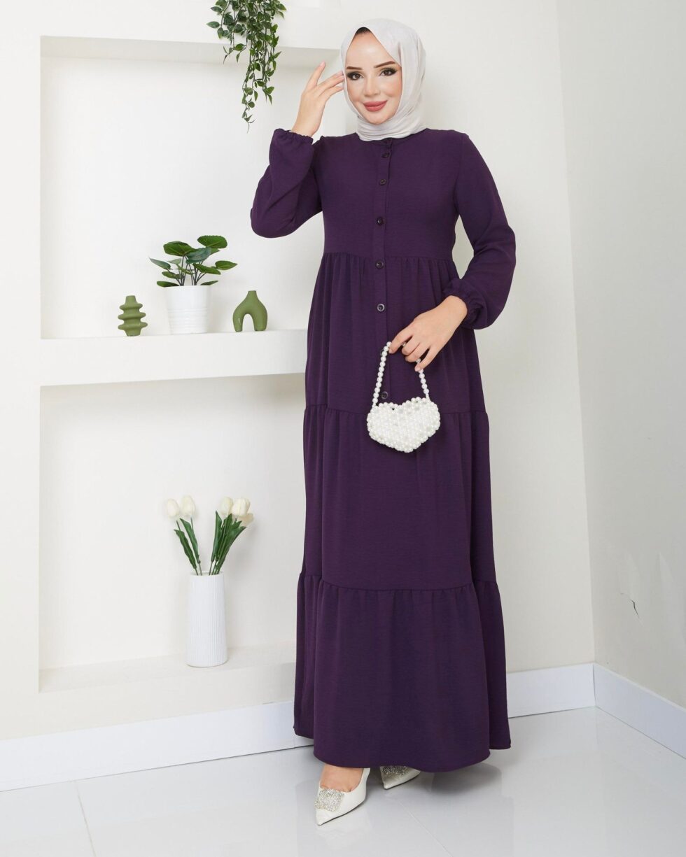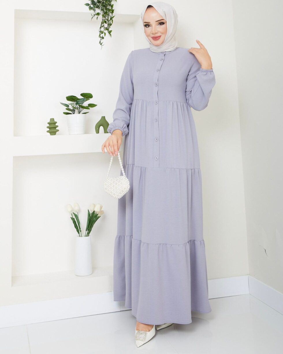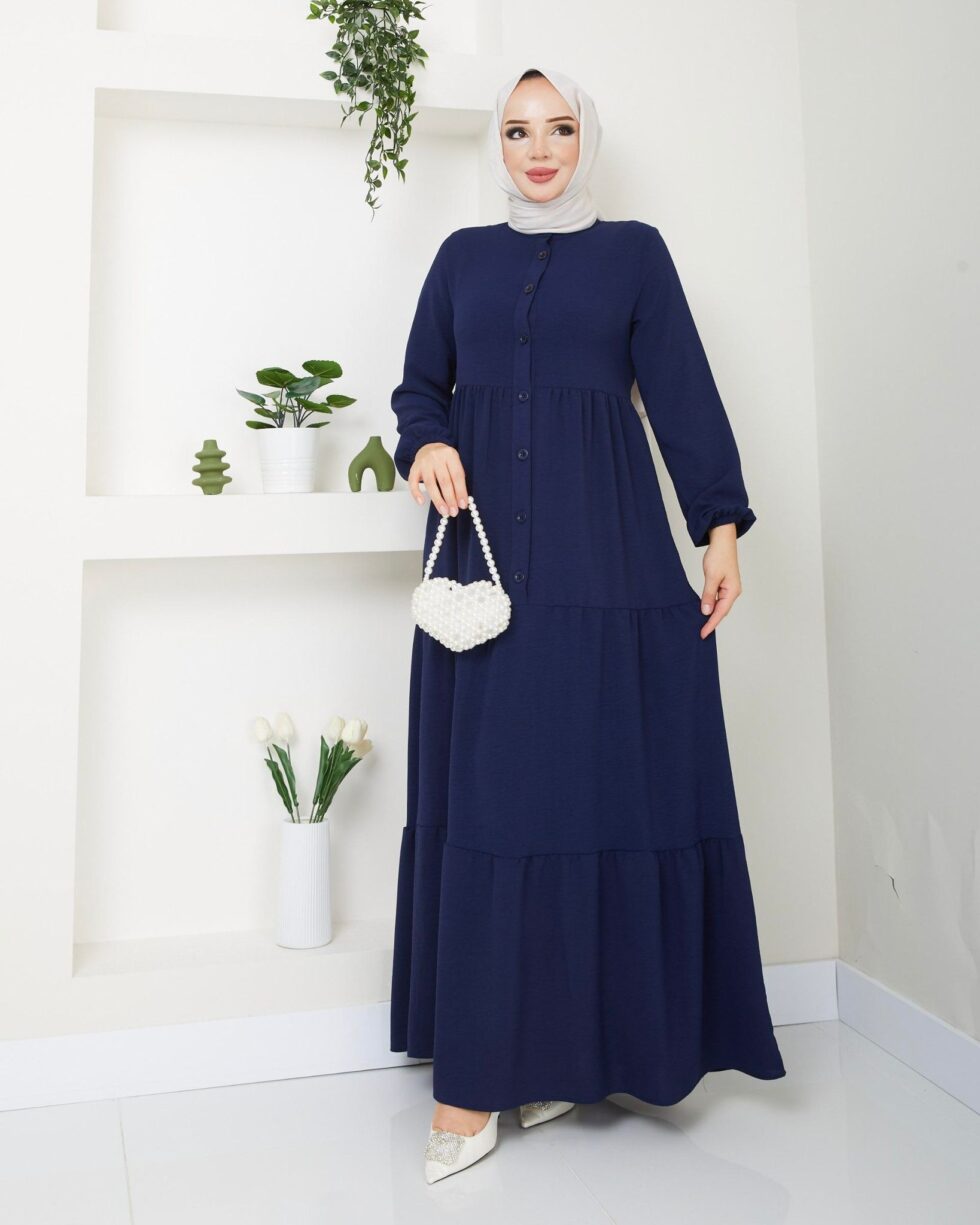 Zamansız şıklığın modern yorumu olan bu uzun elbise, sade ve zarif tasarımıyla günlük stilinize sofistike bir dokunuş katıyor. Ön kısmındaki düğme detayları klasik bir görünüm sunarken, katlı etek formu elbiseye hareketli ve feminen bir duruş kazandırır.
