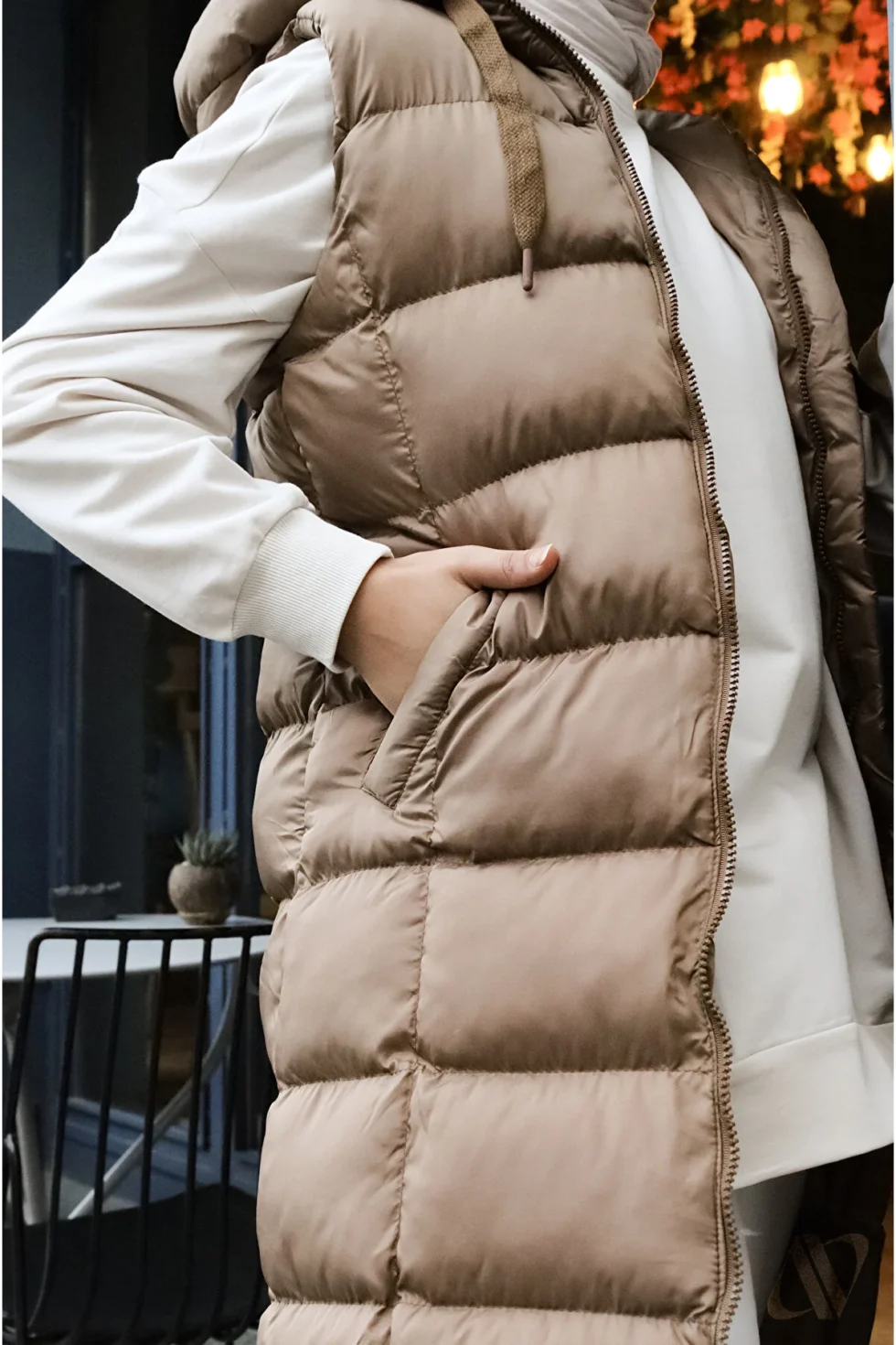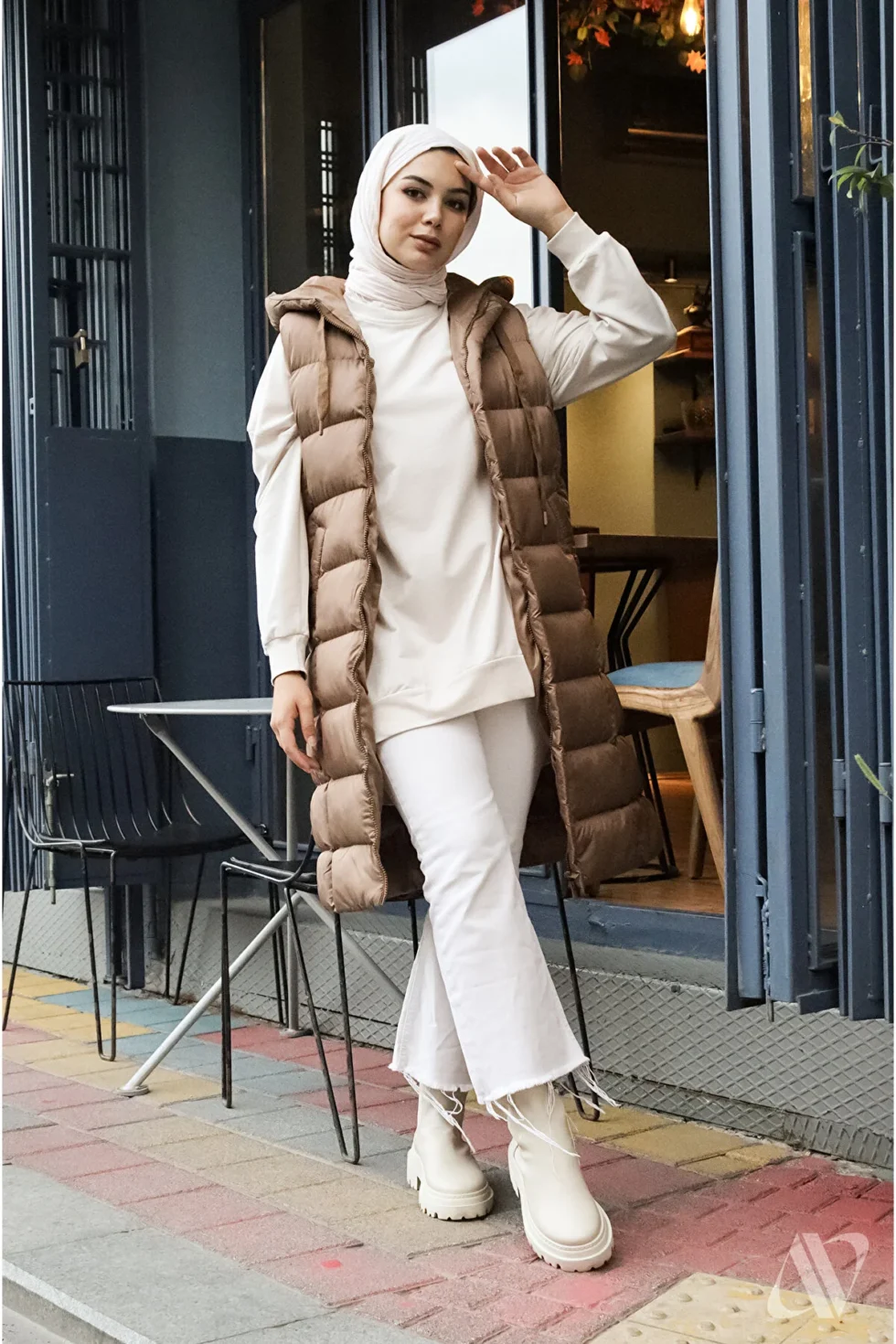 • Manken boy:1.64 cm 50kg Manken bedeni: 38. Kombinlerin tamamlayıcı parçası, kapüşonlu elyaflı yelek ,dayanıklı, rahat kumaştan üretilmiştir.