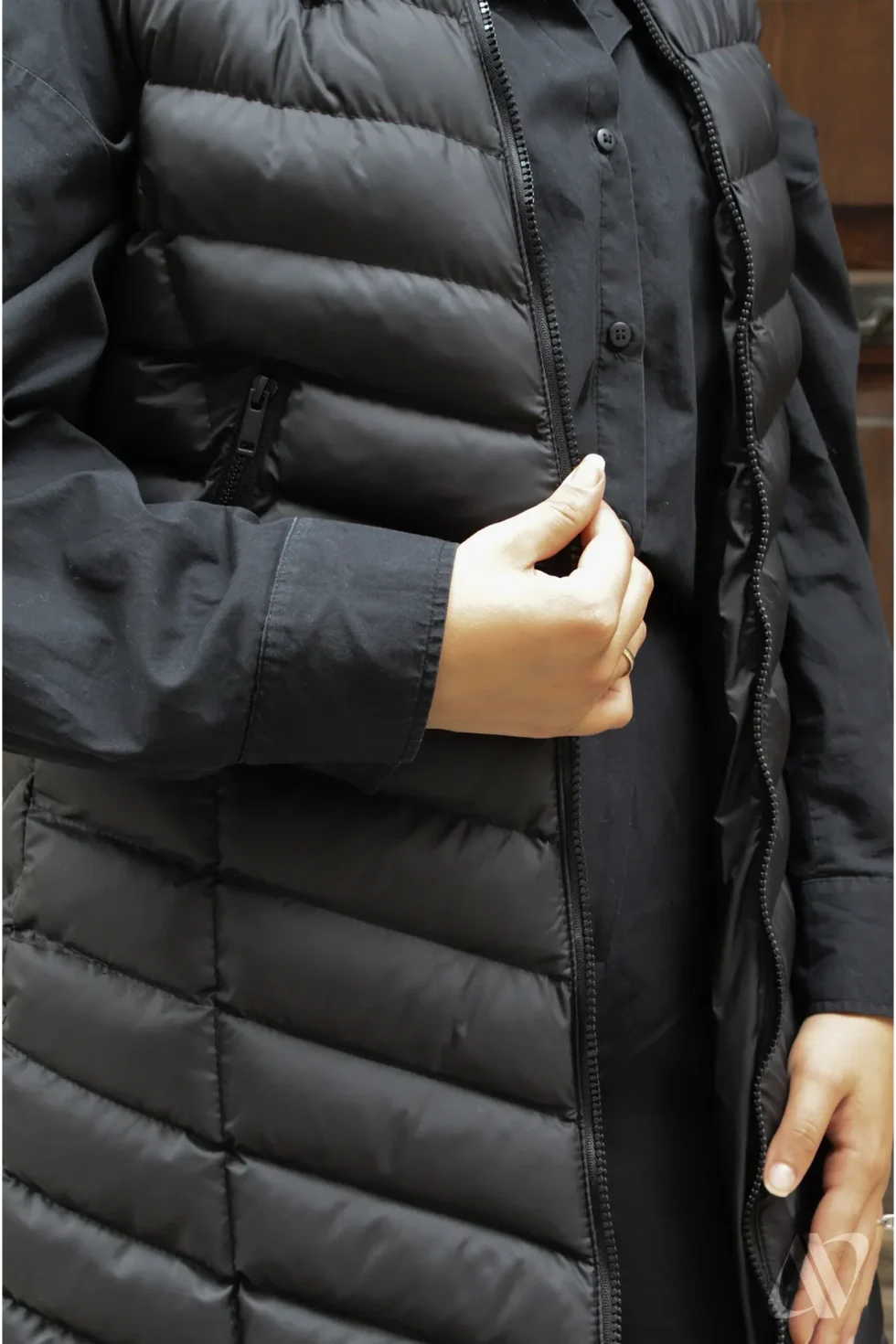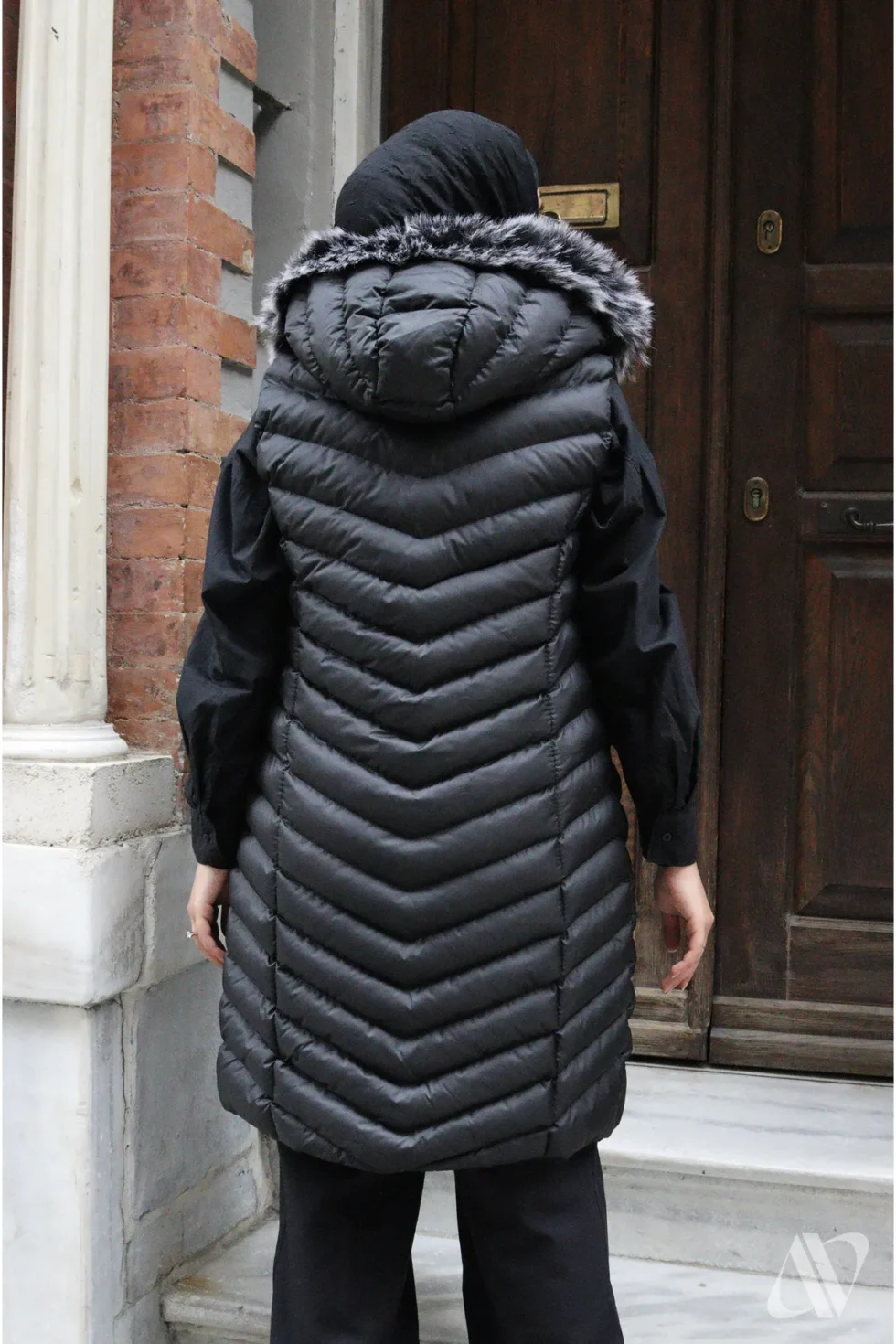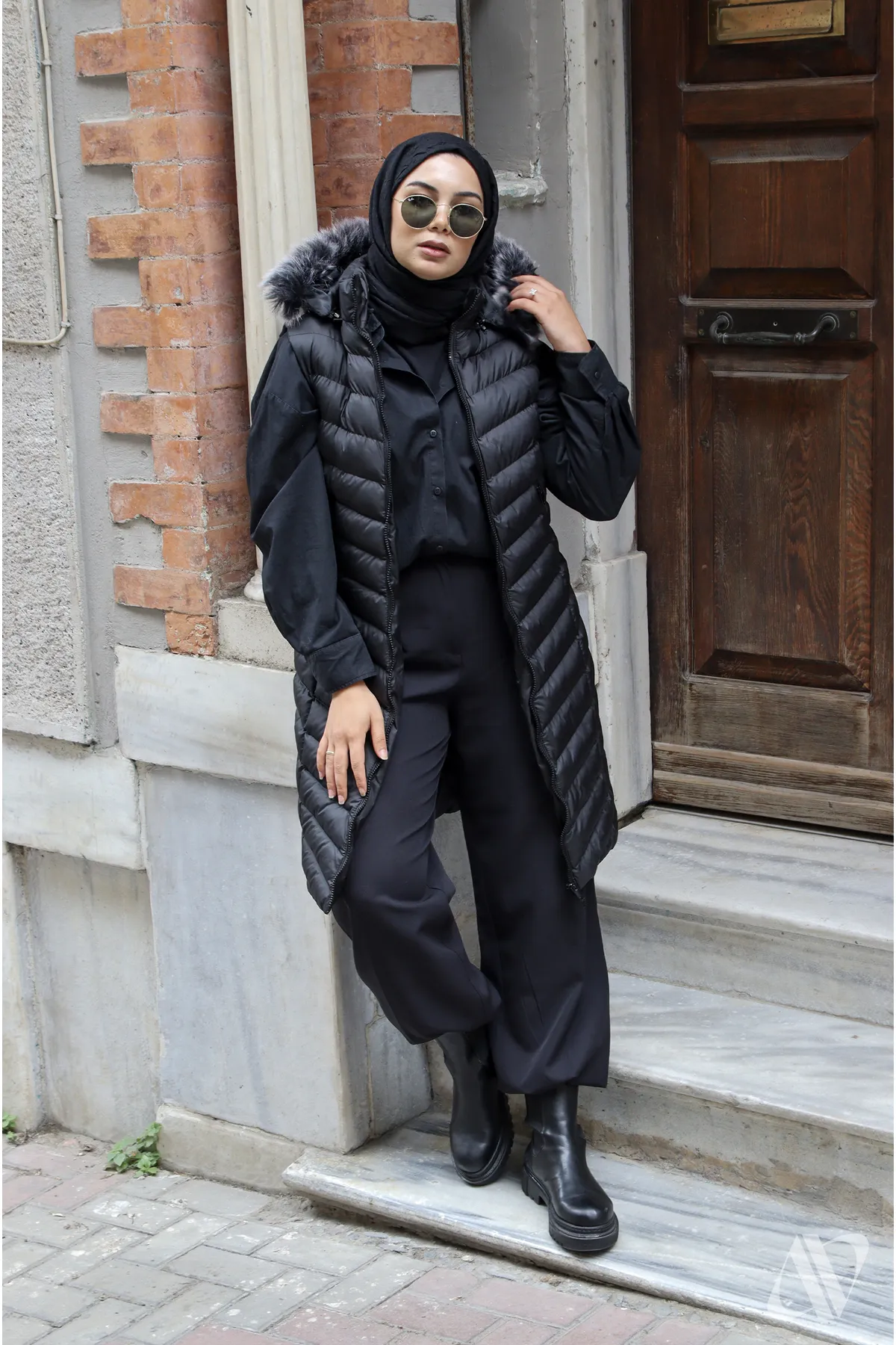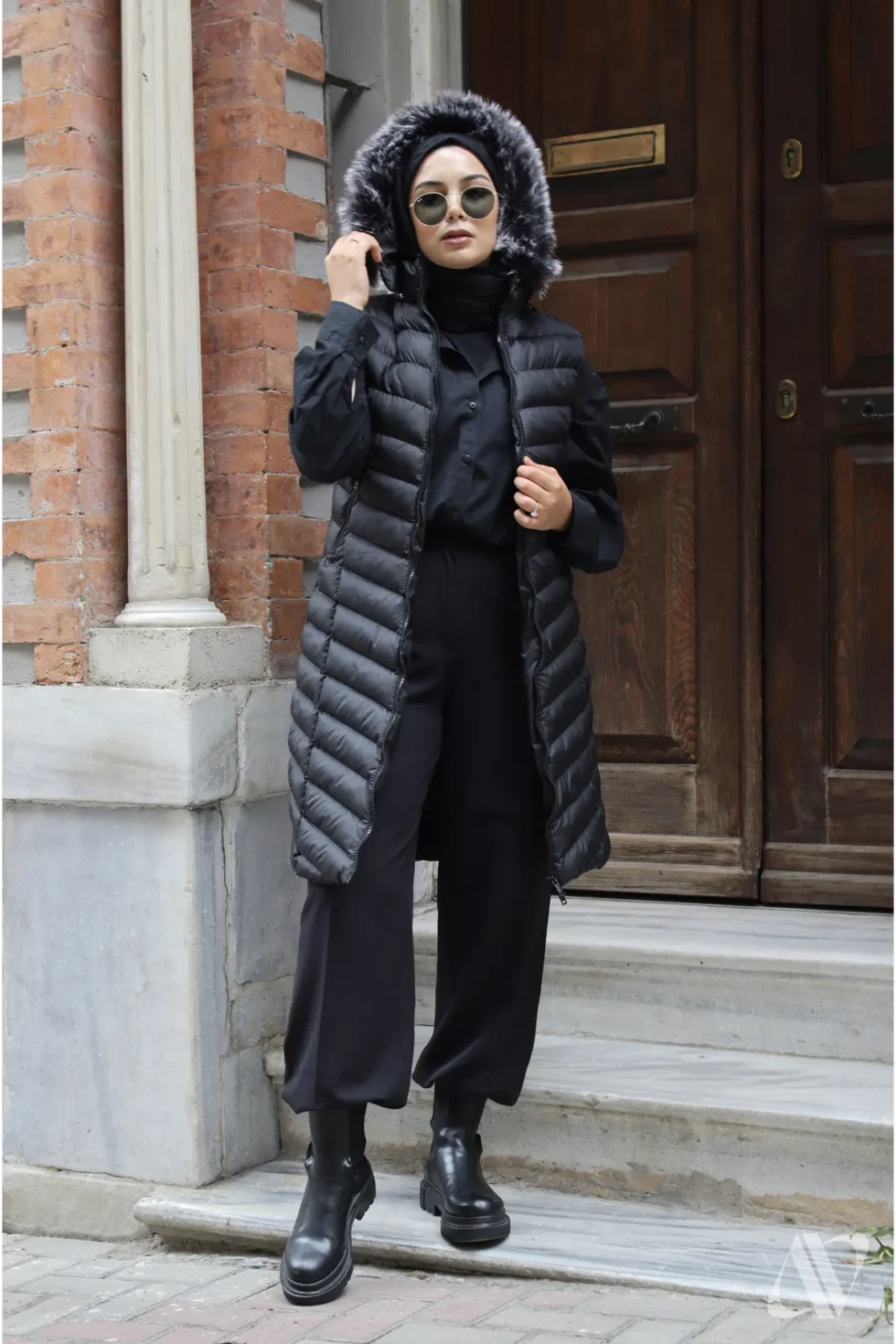 Kürklü Kapşonlu Uzun Şişme Yelek