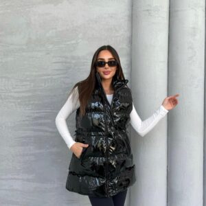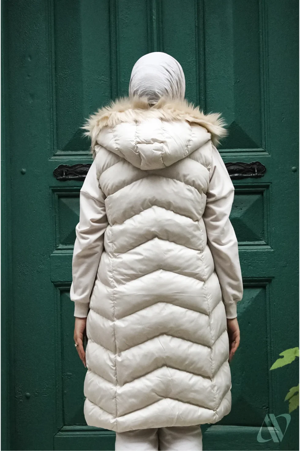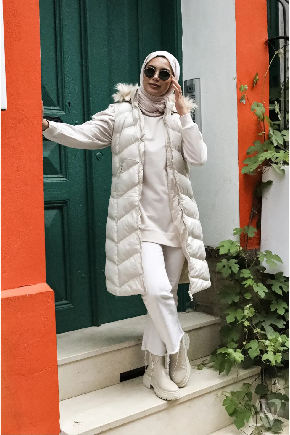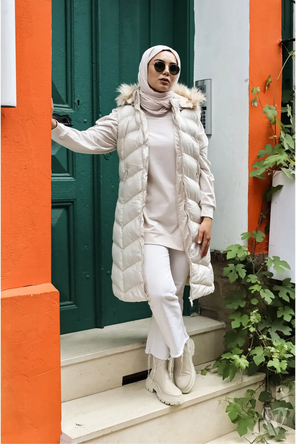 Kürklü Kapüşonlu Uzun Şişme Yelek